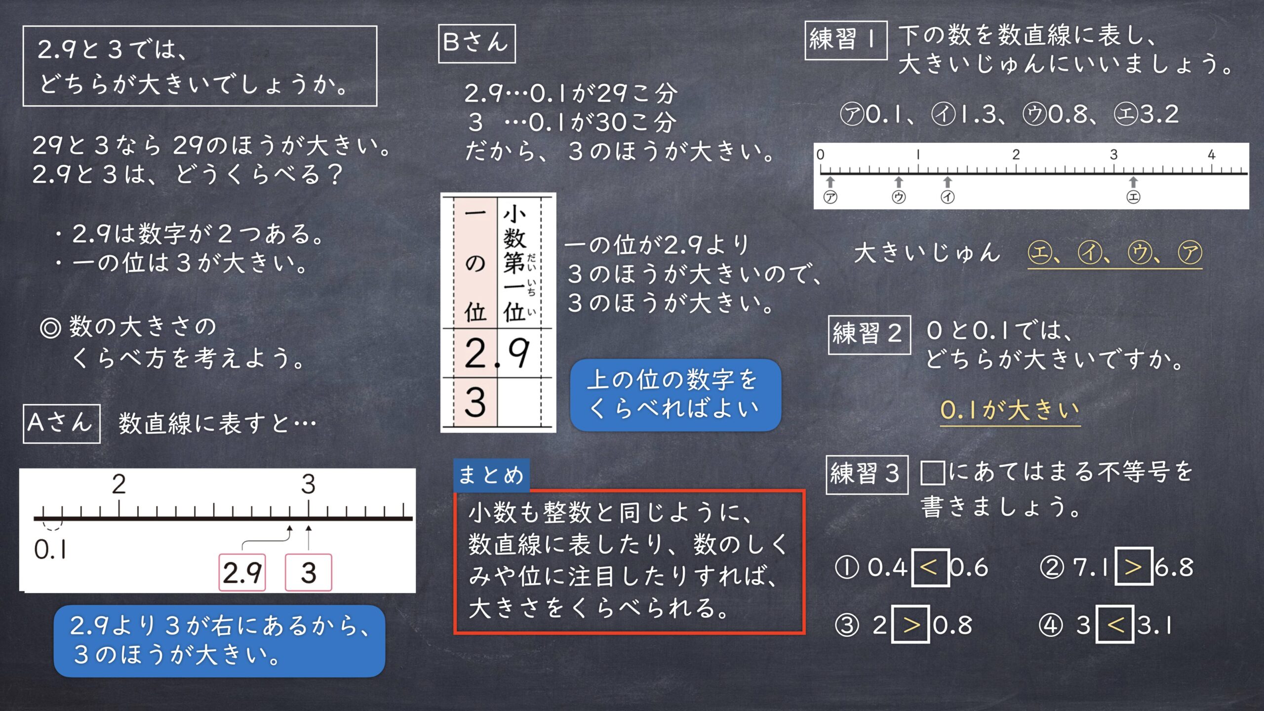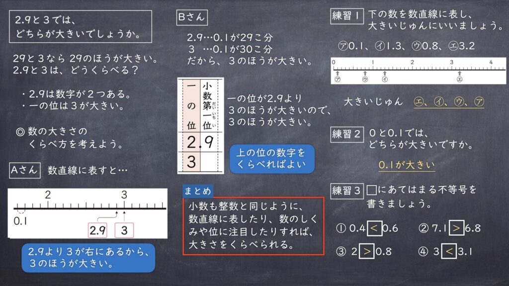 [思判表]整数の大小関係と同様に、数直線を活用したり、小数の相対的な大きさや数の構成に着目したりして、小数の大小関係を考え、説明している。