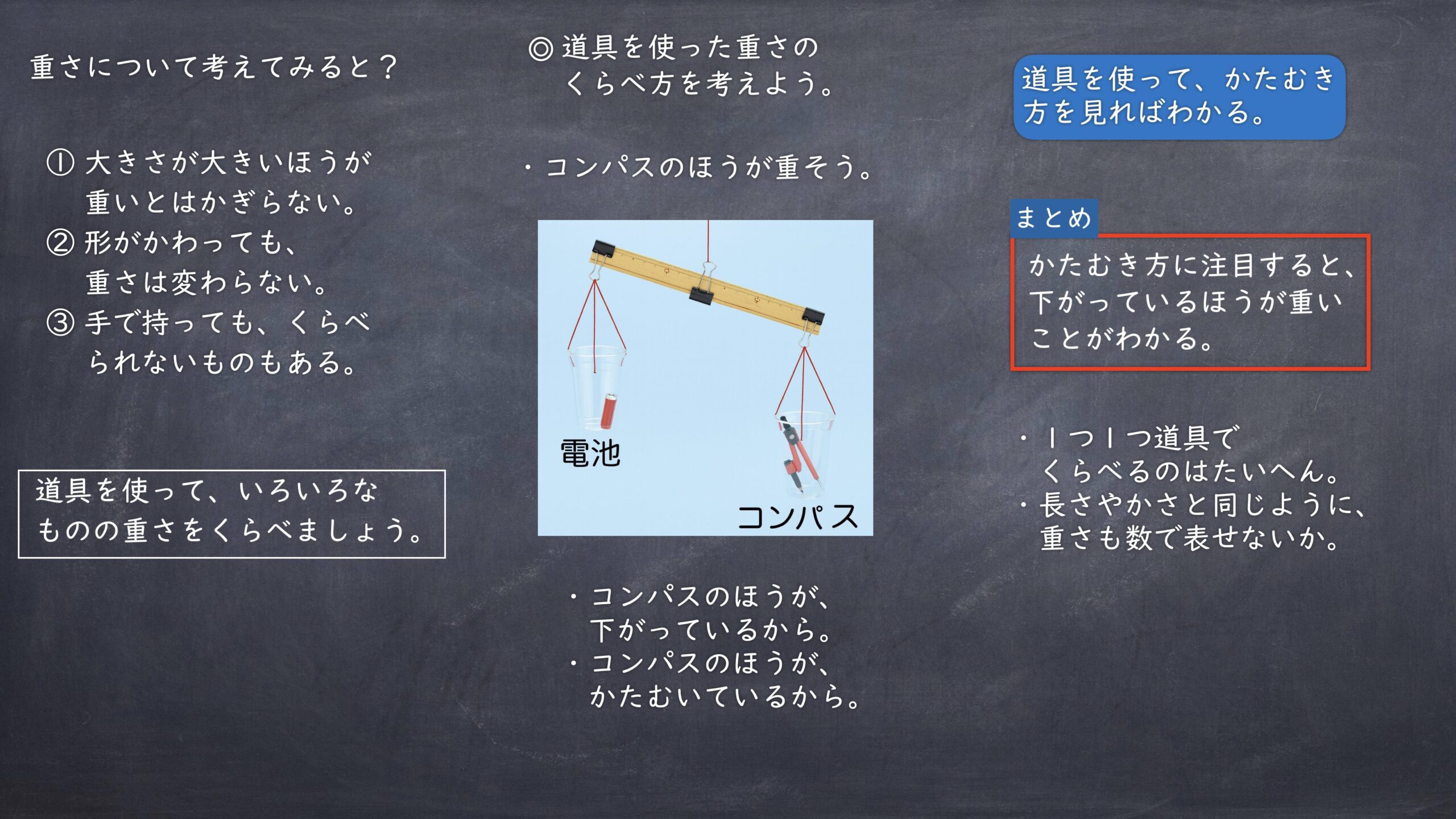 <目標>身の回りのものの重さについて、道具や基にする大きさを定め、比較する方法を考え、説明することができる。