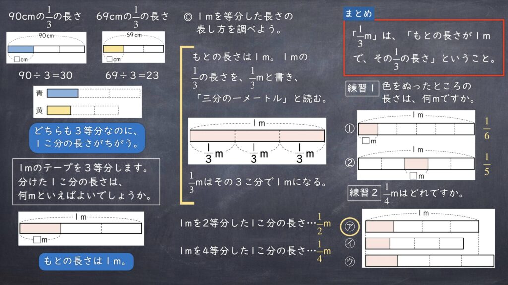 [知技]既習の分数の表し方を用いて、もとの長さを1mとしたとき、3等分した1こ分の長さを1mの「三分の一」といい、「1/3m」と書くことを理解している。