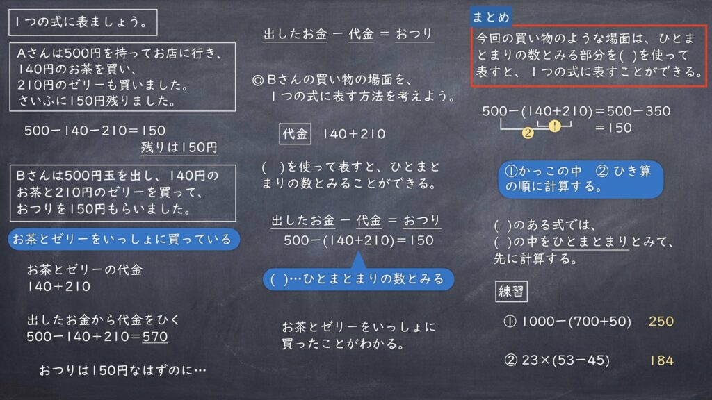 <目標>2つの式で表される場面について、1つの式に表す方法を既習の計算のきまりや( )を用いて考え、説明することができる。