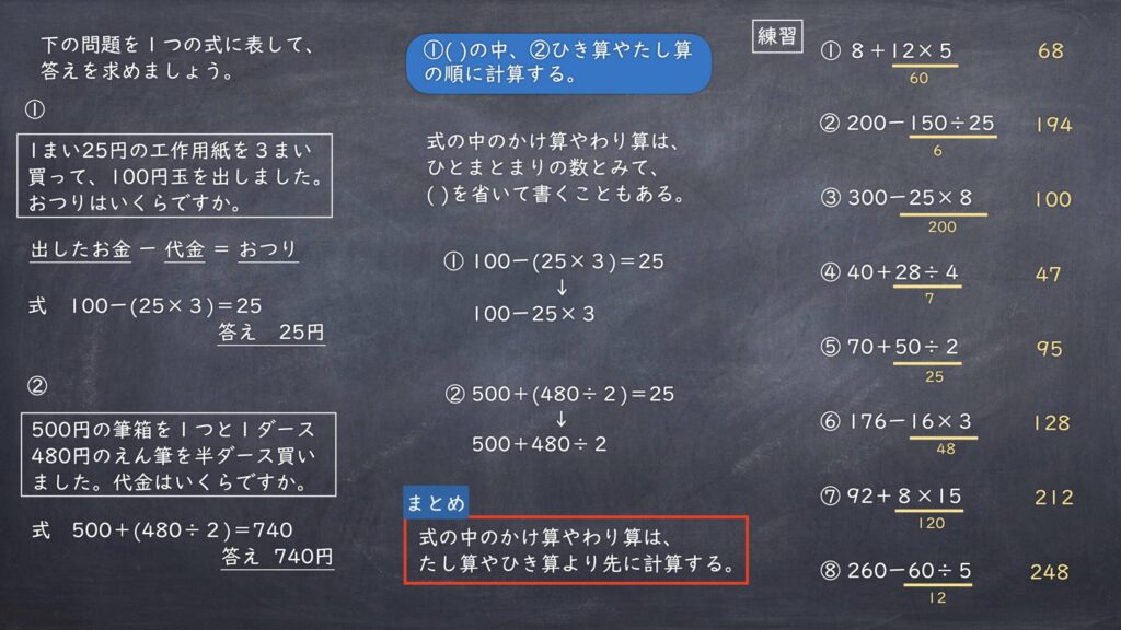 [知技]四則混合や( )のある式の計算順序を理解し、計算することができる。