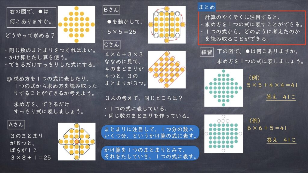 <目標>ドットの数の求め方を図や式に表たり、図や式から考え方を読み取り説明したりすることができる。