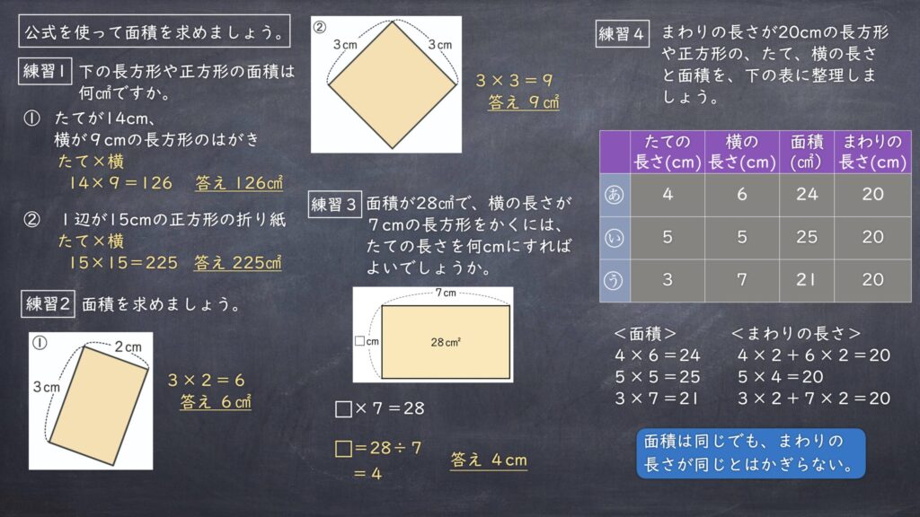 [知技]公式を用いて、長方形や正方形の面積を求めることができる。