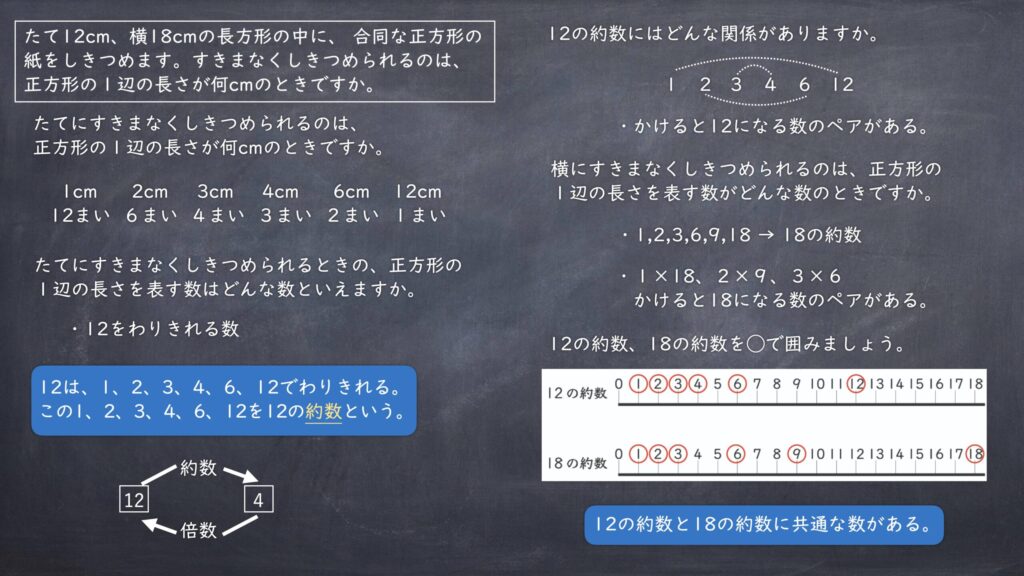 <問題>たて12cm、横18cmの長方形の中に、合同な正方形の紙をしきつめます。すきまなくしきつめられるのは、正方形の1辺の長さが何cmのときですか。