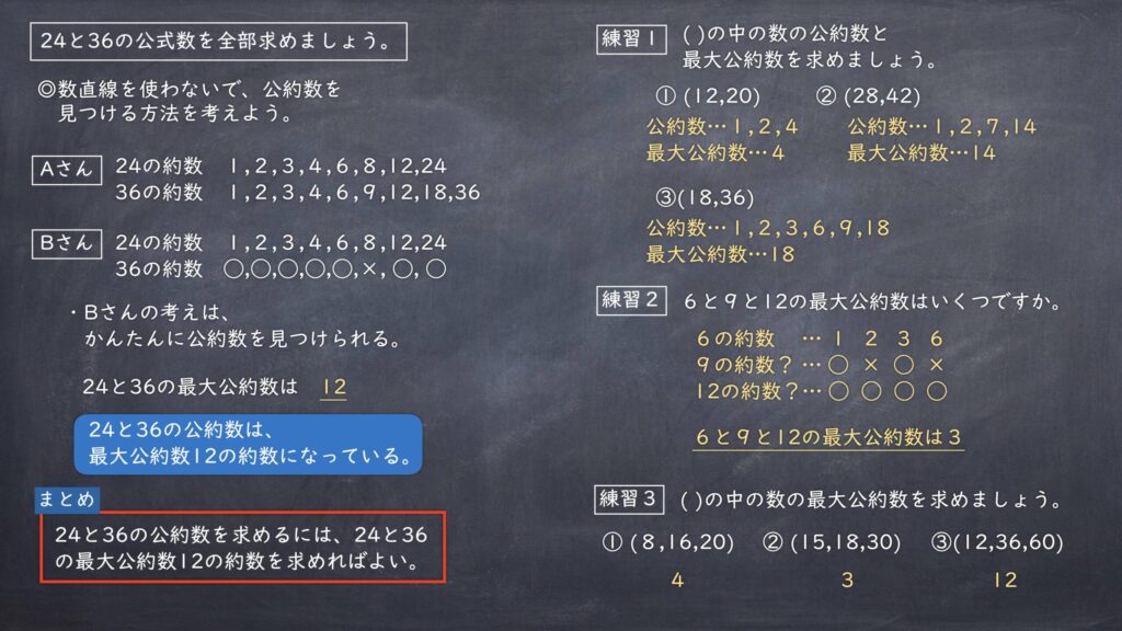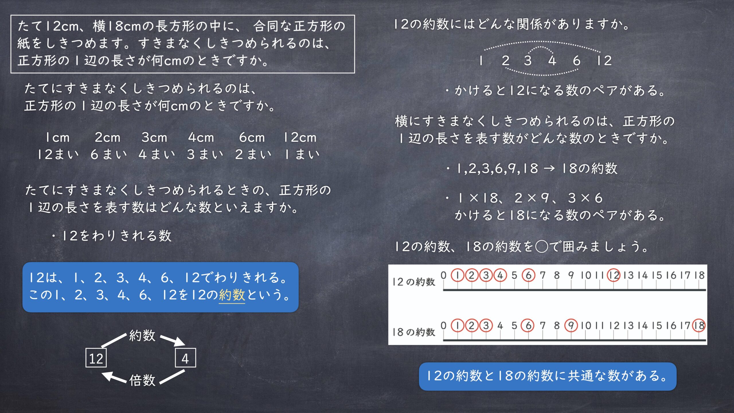 <目標>2つの数の公約数は、最大公約数の約数になっていることを理解し、2つの数の公約数を求めることができる。