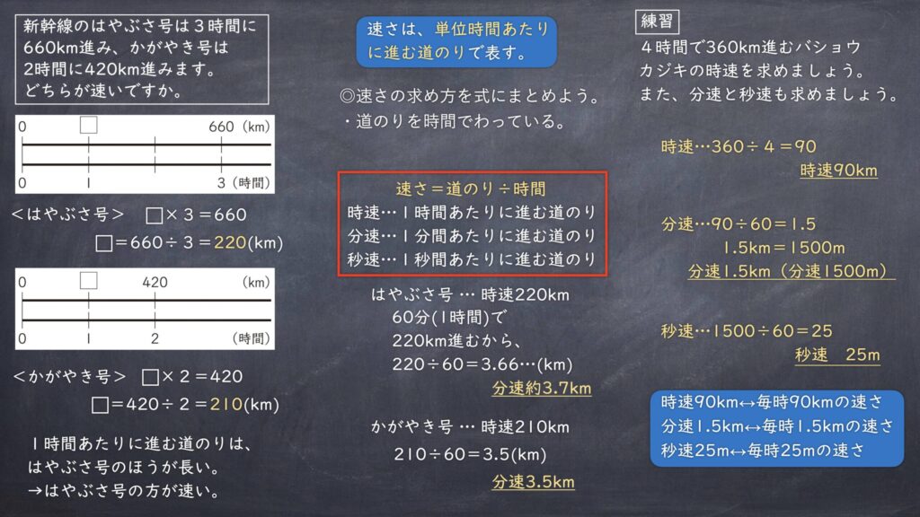 🧠:速さの表し方🧱、速さを求める式をつくり、速さを求めること✔️