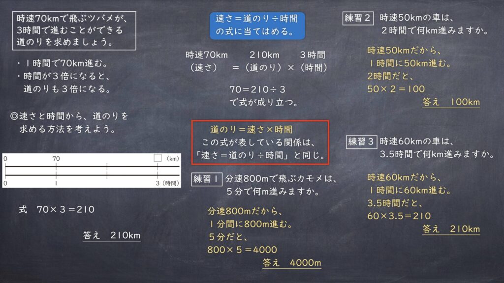 <目標>道のりを求める式を理解し、それを適用して道のりを求めることができる。