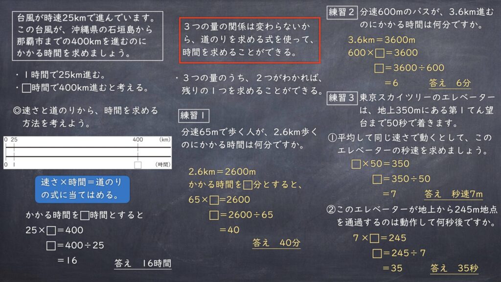 <問題>台風が時速25kmで進んでいます。この台風が、沖縄の石垣島から那覇市までの400kmを進むのにかかる時間を求めましょう。
