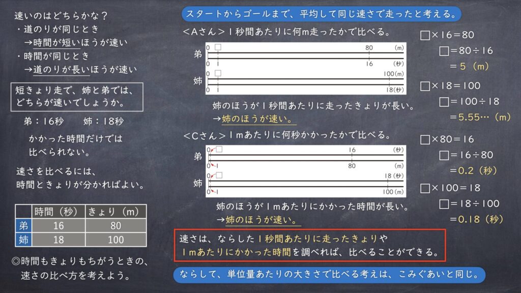🚀:速さの比べ方を、時間と距離の2量🧱、単位量当たりの大きさの🤔を🧰🤔🚶♂️