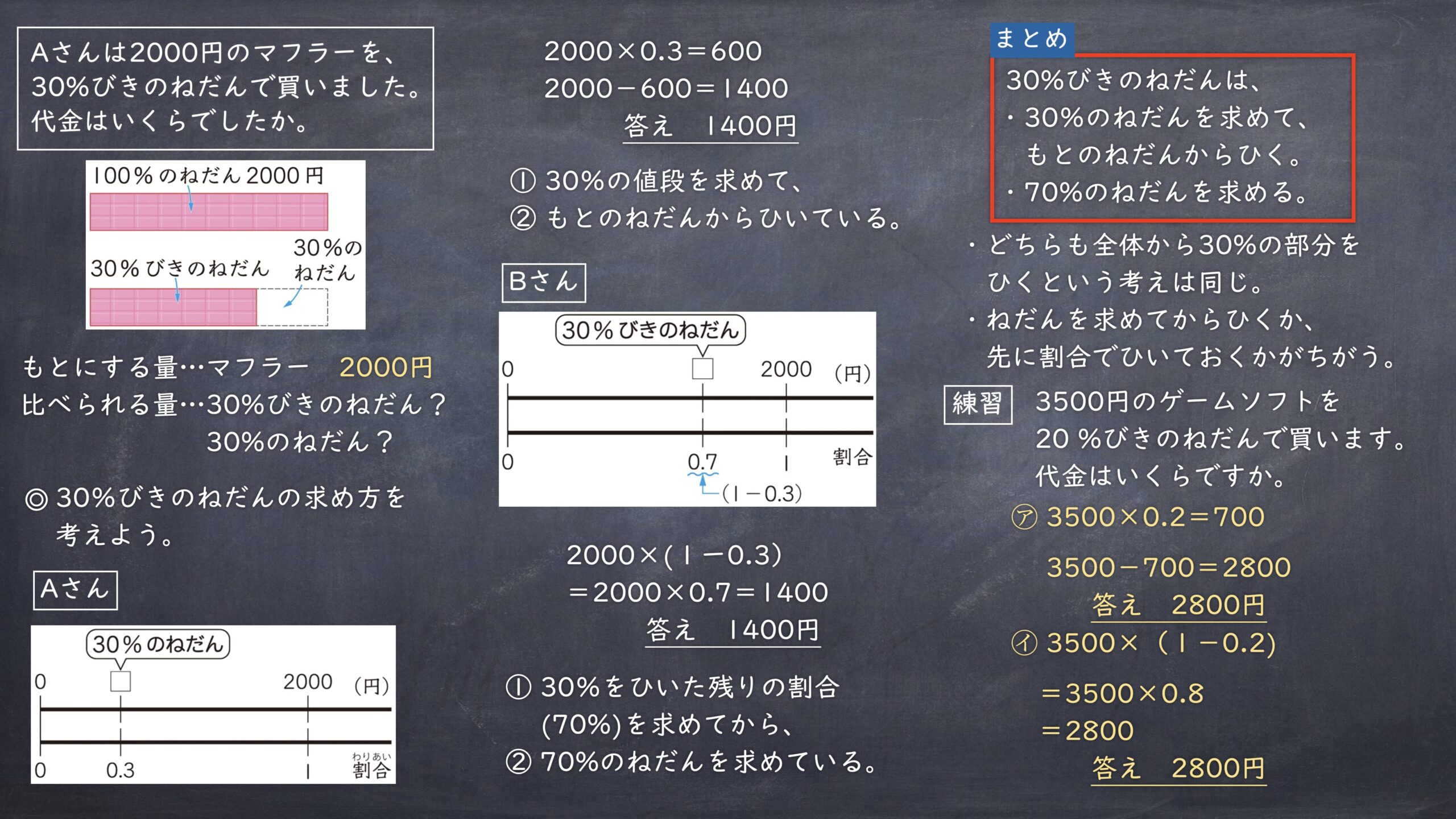 <問題>みかさんは、2000円のマフラーを30%びきのねだんで買いました。代金はいくらでしたか。