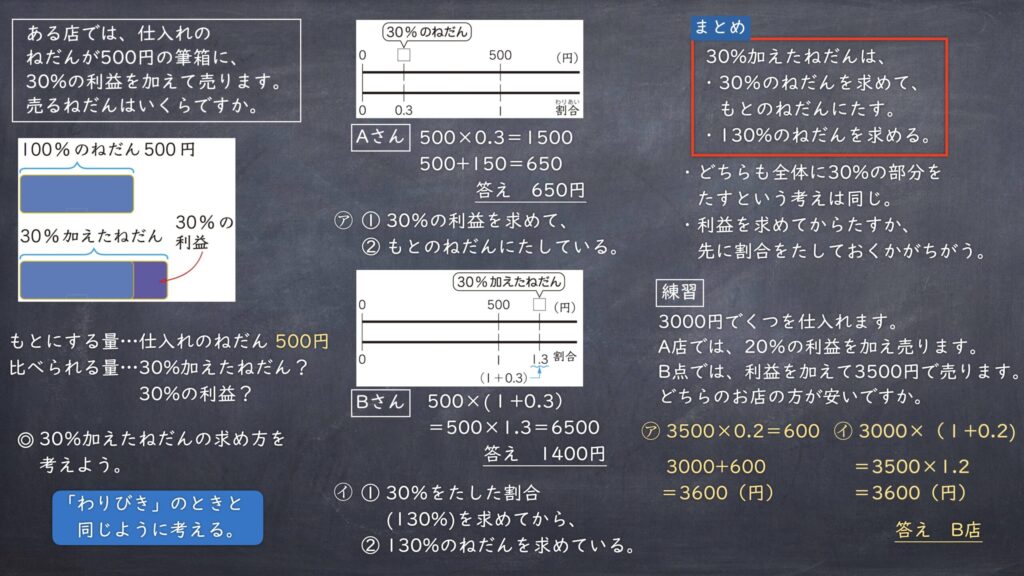 💭:割引や割増の場面で、ひかれる金額や加える金額、割合に🔍解決の仕方を🤔🗣️