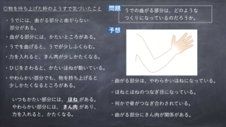 問題大日本図書:うでのほねは、どのようなつくりになっていて、どのように動くのだろうか。大日本図書:うでのきん肉は、どのようなつくりになっていて、どのように動くのだろうか。東京書籍 :うでの曲がる部分は、どのようなつくりになっているのだろうか...